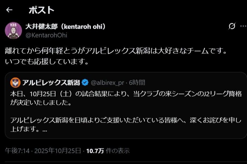 2012~15年に在籍し、新潟で主将も経験した大井健太郎さんも古巣のJ2降格を受けて、Xでメッセージを発信した。