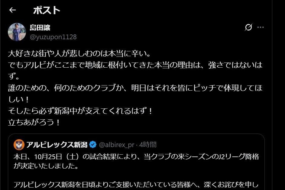 昨季まで新潟で5シーズンプレーし、今季は日本フットボールリーグ(JFL)のクリアソン新宿に在籍するMF島田譲はX(旧ツイッター)で次のようなコメントを投稿した。