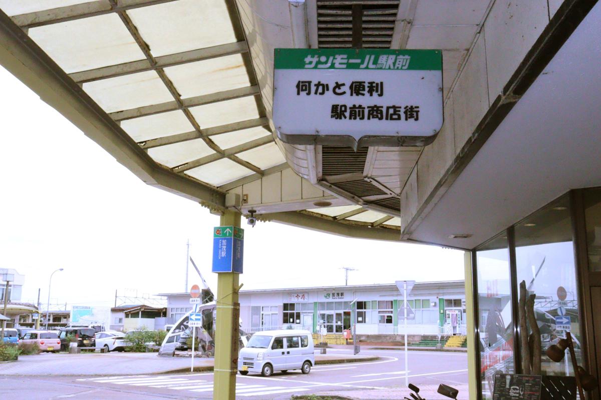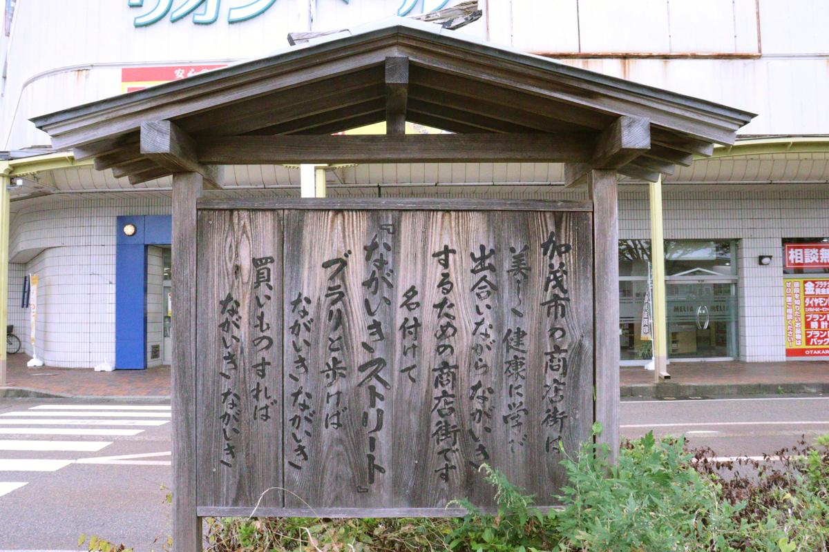 「ブラリと歩けば ながいき ながいき 買いものすれば ながいき ながいき」。加茂市を訪ねた10月22日、まずJR加茂駅前にある看板に目が止まりました。ここから約1・3キロ続く商店街は通称ながいきストリート。「訪れる人も商う人も長生きしてほしい」と願って名付けられたそうです。
