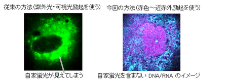 【画像:https://kyodonewsprwire.jp/img/202510247720-O5-plB40DO0】 図2 今回の赤色~近赤外光同時励起を用いる手法では、細胞の自家蛍光を含まない正しいイメージを観察することができる。