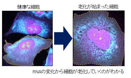 図: 細胞に無害な赤色光~近赤外光を2種類用いて励起することにより細胞内でDNAとRNAを同時に見分ける(左)と細胞が老化していくのがわかる(右)