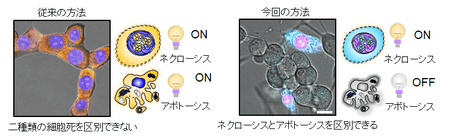 【画像:https://kyodonewsprwire.jp/img/202510247720-O7-0XMCUufW】 図4 プログラムされた細胞死(アポトーシス)と望まない偶発的な細胞死(ネクローシス)の区別が可能