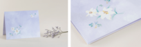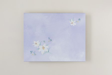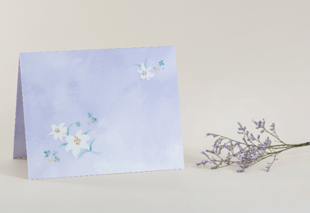 紫を基調とした水彩表現と百合モチーフで、宗教・宗派を問わず幅広く利用可能。言葉を主役に引き立てる落ち着きと温かみを両立させています。