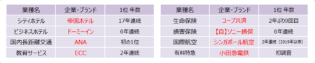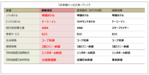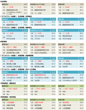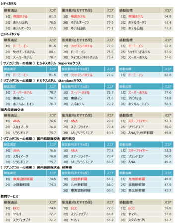※各業種のランキング対象企業・ブランドのうち、原則として、顧客満足・推奨意向(おすすめ度)・感動指標の各3位以上の企業・ブランドを表示。その他の指標の結果については、別添資料参照。ビジネスホテル、国内長距離交通、生命保険、損害保険については、サブカテゴリーも表示。