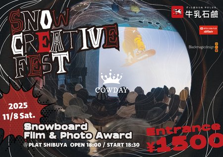 牛乳石鹸共進社株式会社(本社:大阪府大阪市、代表取締役社長:宮崎悌二 以下、牛乳石鹸)が実行委員を務めるスノーボード映像・写真コンテスト「COWDAY SNOW CREATIVE FEST 2025」の上映会&表彰式を、11 月 8 日(土)に PLAT SHIBUYA(エムズ原宿/渋谷区)にて開催します。