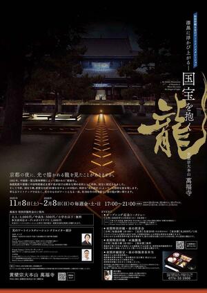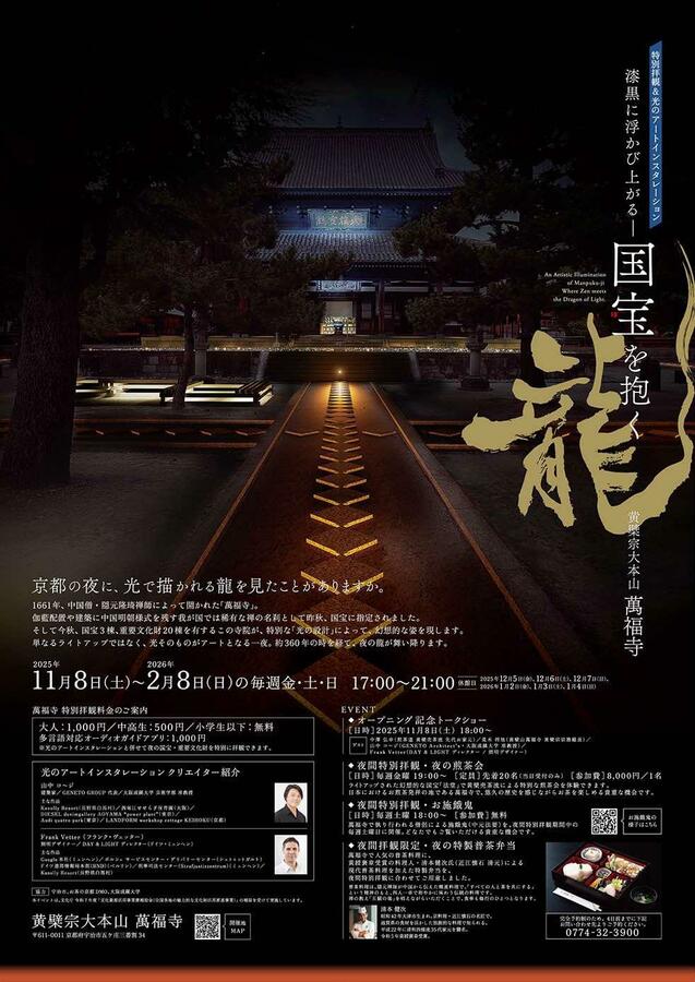 1661年、中国僧・隠元隆琦禅師によって開かれた「萬福寺」。 伽藍配置や建築に中国明朝様式を残す我が国では稀有な禅の名刹として昨秋、国宝に指定されました。そして今秋、国宝3棟、重要文化財20棟を有するこの寺院が、特別な「光の設計」によって、幻想的な姿を現します。 単なるライトアップではなく、光そのものがアートとなる一夜。 約360年の時を経て、夜の龍が舞い降ります。