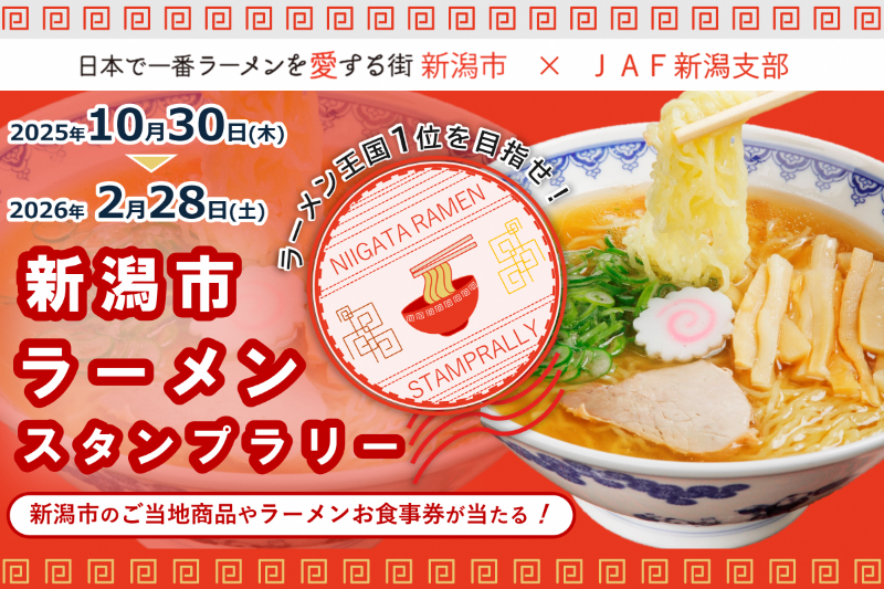 このたびプロジェクトの一環として、一般社団法人日本自動車連盟(JAF)新潟支部との共催にて「ラーメン王国1位を目指せ!新潟市ラーメンスタンプラリー」を開催することとなりました。