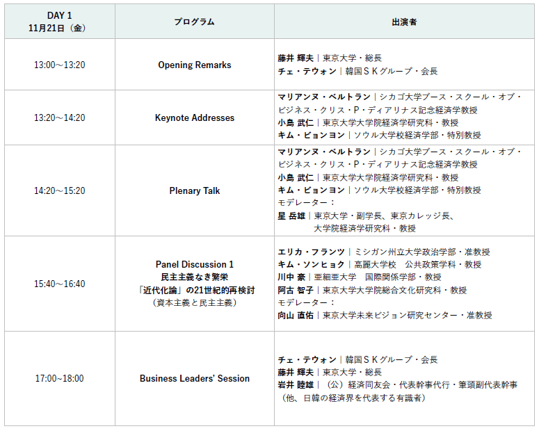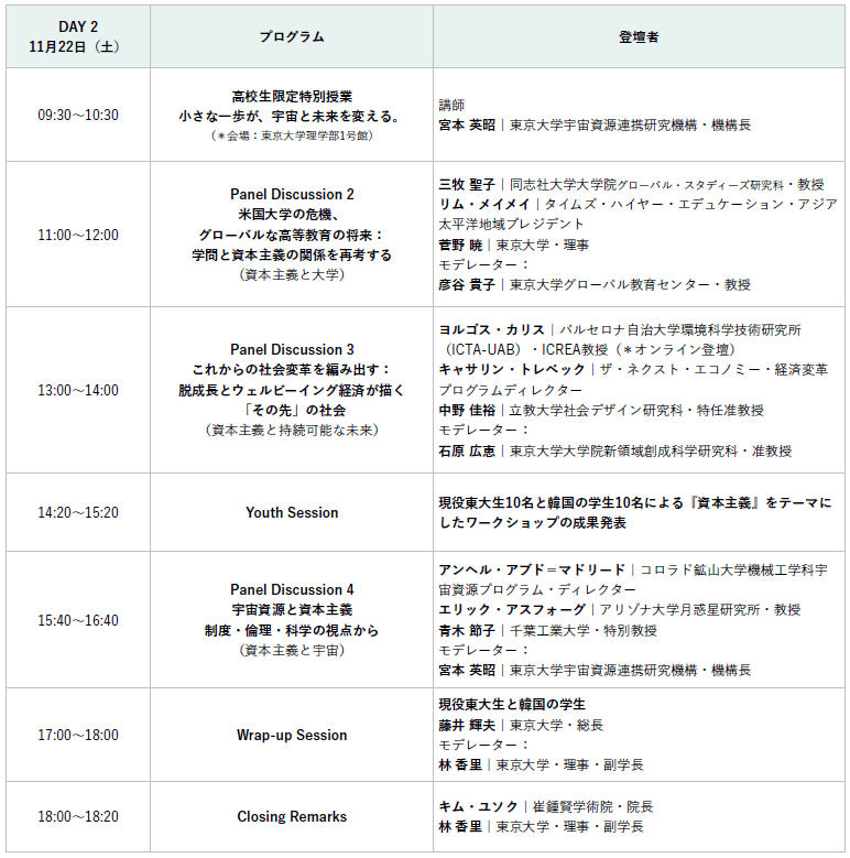 若い世代を中心に、どのような未来を築いていけるのか。社会的価値をどう再定義し、計り直していくべきなのか。アカデミアと社会が交わる対話の場として、11のセッションを開催します。「資本主義と民主主義」「資本主義と大学」「資本主義と持続可能な未来」「資本主義と宇宙」をテーマにしたパネルをはじめ、日韓の経済界リーダーによるセッション、東京大学と韓国の学生が研究発表を行うユースセッション、高校生向けの特別授業など、世界を代表する約30名の識者が2日間にわたり議論をおこないます。2019年にスタートした本フォーラムは、東アジアを起点に国際社会へ英語で発信する、希少で重要な対話の場として発展してきました。東京大学をはじめ世界のアカデミアが進める最先端の研究や社会実践を交差させながら、どのように私たちの未来を形づくっていけるのか。「Shaping the Future(未来を形づくる)」を継続テーマとして、これまでに「グローバルコモンズ」「科学と人の心」「哲学と科学の対話」「社会的分断とデジタル革新」「デザイン」などをテーマに取り上げ、議論を重ねてきました。