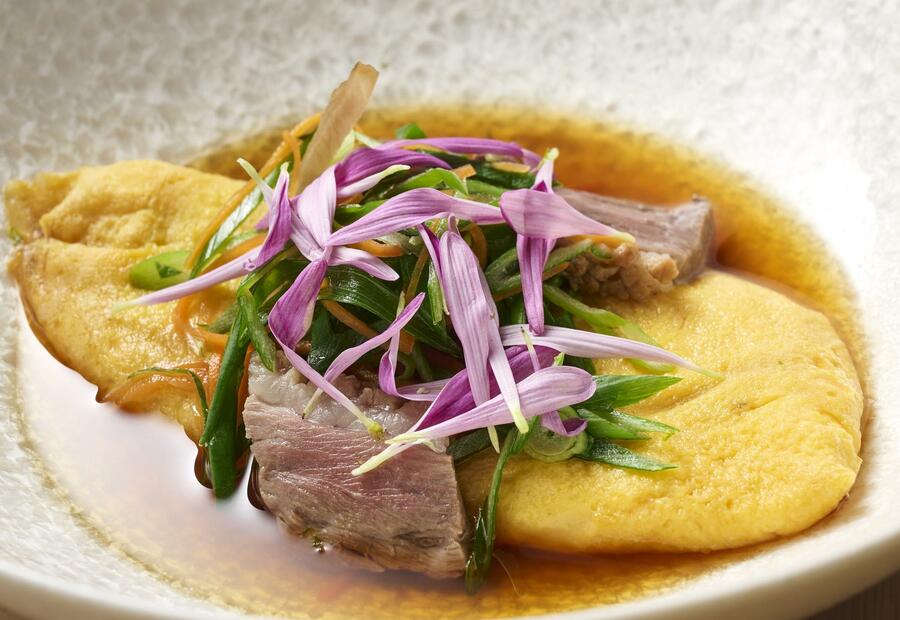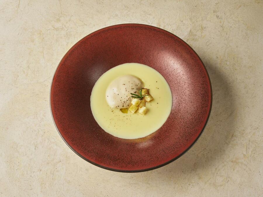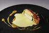 (左)焼き芋のポタージュ ハーブ香る焦がしバターのエスプーマを合わせて