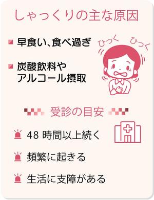 しゃっくりそのものは皆さん経験があると思います。急に体が跳ねて「ヒック」という音が出る、あれです。しゃっくりは横隔膜が刺激を受けて急に収縮することで起きる現象なのです。刺激となるものはいろいろありますが、横隔膜の近くから直接刺激を受...