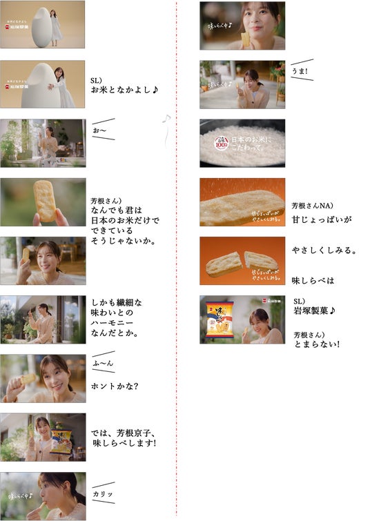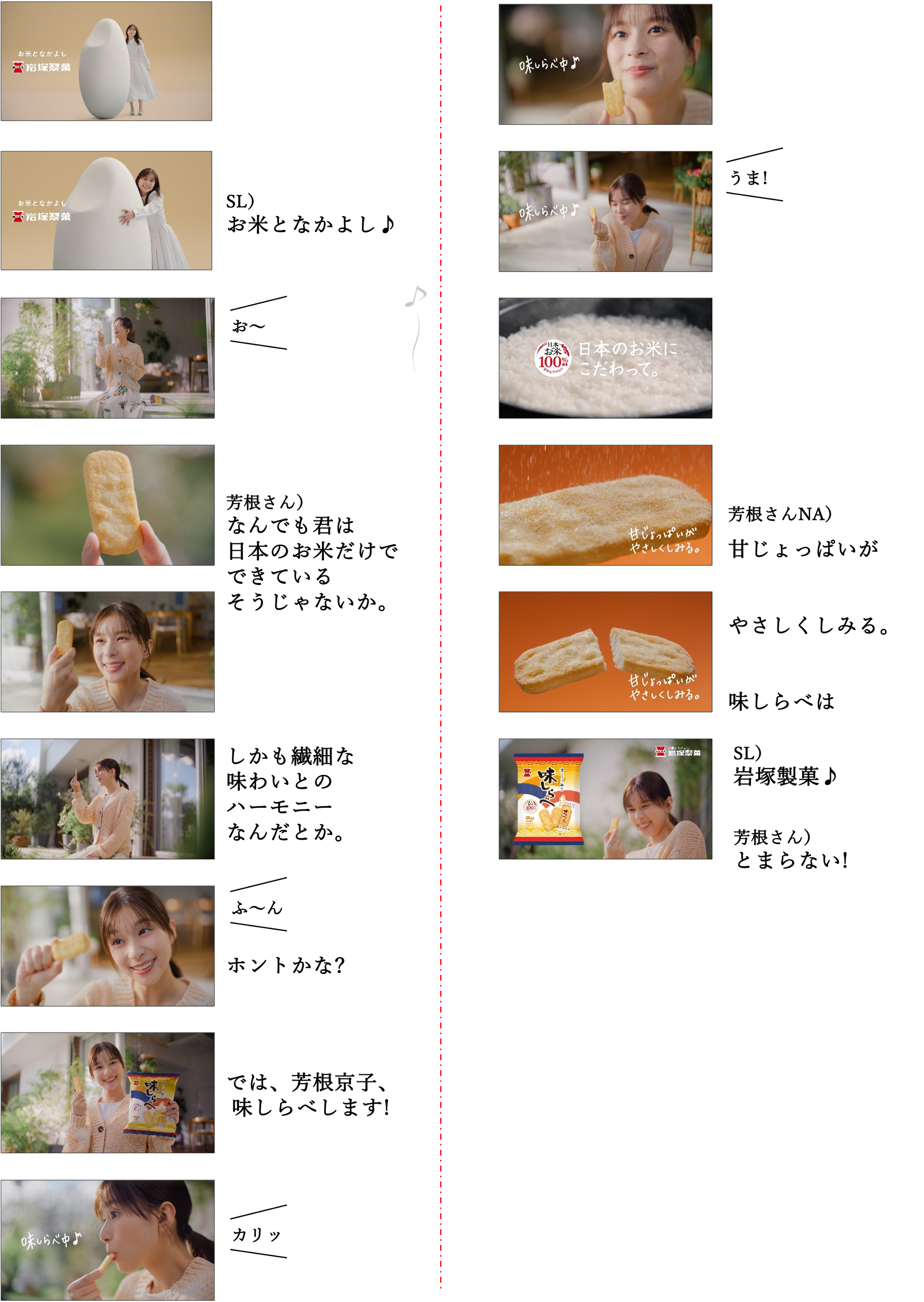 日本のお米100%の岩塚製菓株式会社(本社:新潟県長岡市/代表取締役社長COO 槇 大介)は、俳優の芳根京子さんが出演する、岩塚製菓のロングセラー商品「味しらべ」のTVCM『味しらべ中』篇を、11月1日(土)より全国で放映開始いたします。