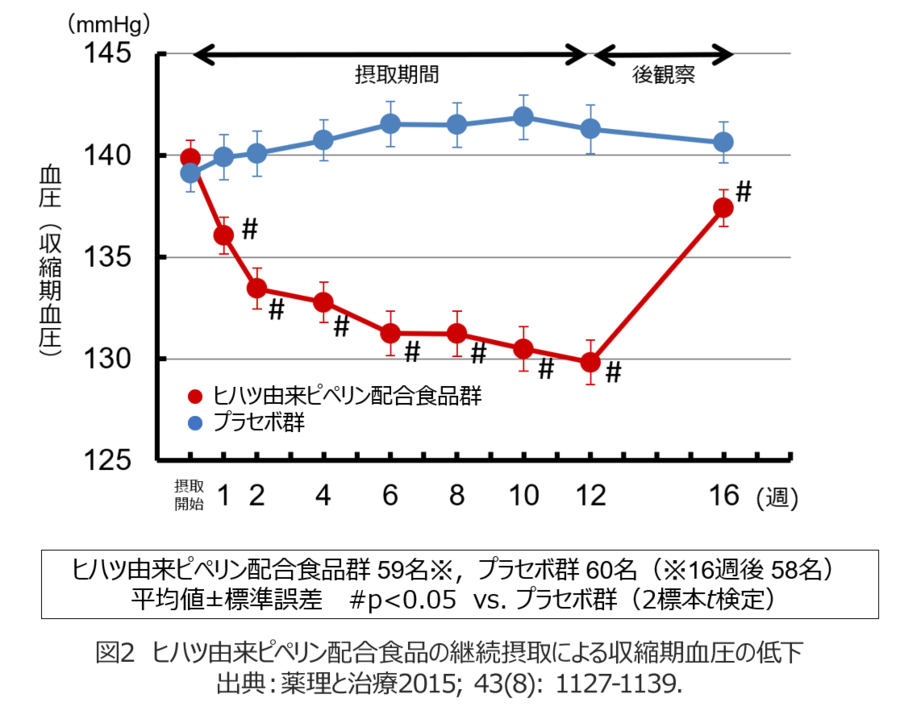 ② ヒハツ由来ピペリンを配合した食品を用いた臨床試験を行い、血圧が高めの方の血圧を下げる機能を確認しました。