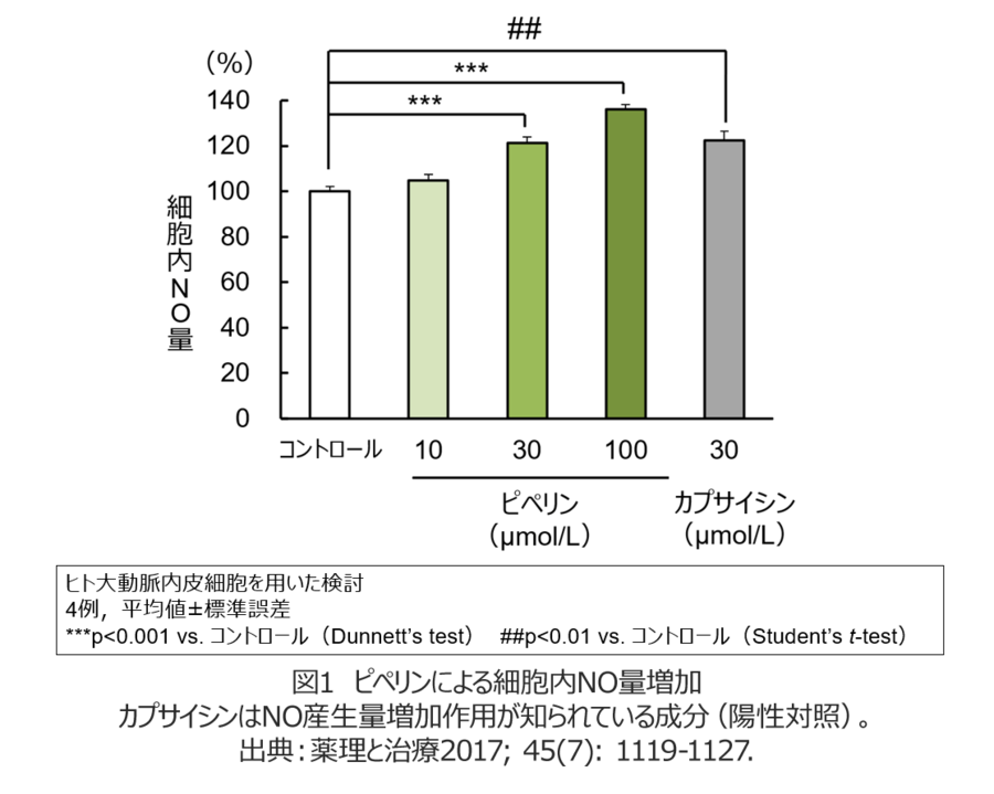ヒト大動脈内皮細胞を培養し、ピペリンを添加して細胞内のNO量を測定しました。その結果、ピペリン30、100μ mol/Lを添加すると、ピペリンを添加しない場合に比べ、細胞内のNO量が有意に増加しました(図1)。この結果から、ピペリンはNO産生を促進することで血管を弛緩させ、血圧を低下させると考えられます。