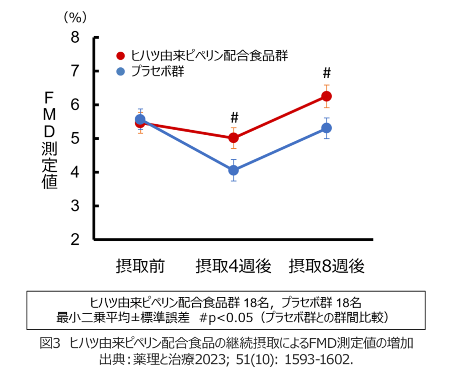 その結果、ヒハツ由来ピペリン配合食品を摂取した群では、プラセボ食品を摂取した群に比べFMD値が有意に高い値を示しました(図3)。FMD値が高いほど、血管が柔らかいことを意味します。