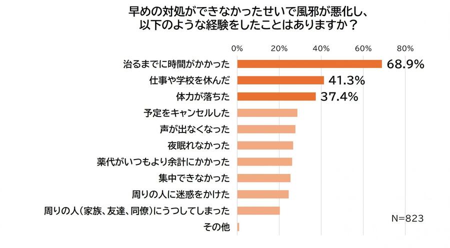 大正製薬(株)の調査(対象者:直近1年間で風邪をひいたことのある20~69歳の男女1208人)によると、約68%の人が「風邪の症状に早めの対処ができなかったことで、風邪が悪化したことがある」と回答しました。そのうち、「治るまでに時間がかかった(約69%)」「仕事や学校を休んだ(約41%)」「体力が落ちた(約37%)」などの経験をした人もいました。