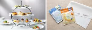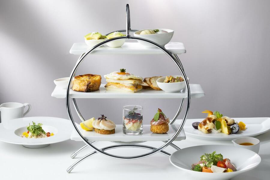 プランオリジナル朝食はアフタヌーンティースタイルでご用意いたします。アクセントカラーには、メガショットをイメージして、オレンジ色や青色を入れております。サラダや玉子料理をはじめ、フレンチトースト、ワッフルなど華やかな朝食を香りとともに楽しみながら、ゆっくりと身体を目覚めさせるひとときをお過ごしください。
