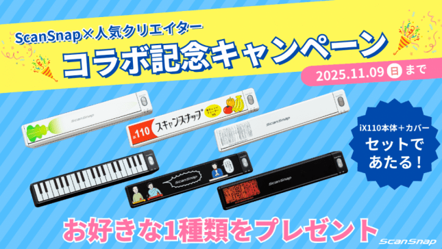 また、このコラボレーションを記念して、ScanSnap 公式XおよびInstagramにて、プレゼントキャンペーンを開催。ScanSnap iX110本体とお好きなデザインカバーのセットを、各SNSで1名様にプレゼントいたします。