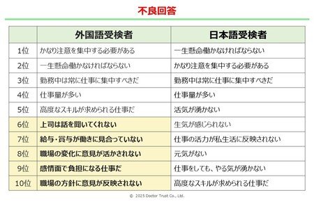 外国語受検者の傾向としては、6~10位のとおり「上司が悩みを聞いてくれない」「ふさわしい給料やボーナスをもらえていない」「意見が反映されていない」など、職場環境や待遇面での満足度が不良であることがわかりました。