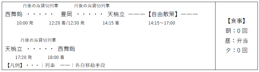 当日は、『丹後の海』を貸し切り、普段は運行しない特別コースを運行するほか、丹後名物ばら寿司の提供や天橋立観光、さらには鉄道好きタレント「斉藤雪乃さん」によるトークなどを実施します。ぜひ、この日しか味わえない『丹後の海』での旅をお楽しみください!