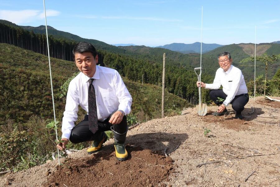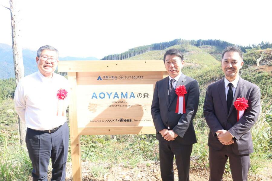 青山商事株式会社(本社:広島県福山市/代表取締役社長:遠藤 泰三)は、高知県梼原町の井高地区で新たな「AOYAMAの森」を開設します。また、これを記念し、2025年10月30日に植樹祭を実施。高知県梼原(ゆすはら)町長 吉田 尚人様、一般社団法人more trees(モアトゥリーズ) 事務局長 水谷 伸吉様、当社代表取締役社長 遠藤 泰三が出席し、植樹をしました。AOYAMAの森は、仲洞地区に加えて、2拠点目となります。