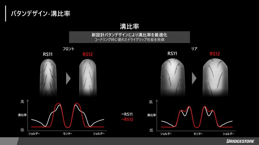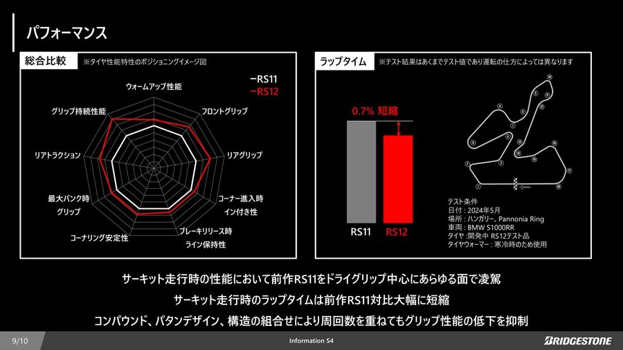 2輪耐久レースで勝ち続けてきた技術を基盤とすることで、ドライグリップを中心としたサーキット走行における性能を全方位で向上させており、ラップタイムは従来品「BATTLAX RACING STREET RS11」対比大幅に短縮しています。加えて、コンパウンド、パタンデザイン、構造の組合せ最適化により周回数を重ねてもグリップ性能の低下を抑制します。これにより、ドライ路面でのスポーティーな走行や、ワインディングからサーキットまで幅広く走行されるライダーの安心・安全と楽しさを足元から支えていきます。※2