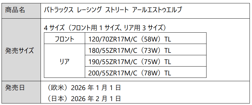 株式会社ブリヂストン(以下、ブリヂストン)は、モーターサイクル用プレミアムスポーツタイヤ「BATTLAX RACING STREET RS12」(バトラックス レーシング ストリート アールエストゥエルブ)を欧米向けに2026年1月、日本向けに2026年2月より発売します。「BATTLAX RACING STREET RS12」は、商品コンセプト「From Circuit to Street」のもと、レース用タイヤ開発で培われてきた技術を搭載することで、一般公道走行用「BATTLAX」のラインアップの中で最も高いドライグリップ性能を発揮する「断トツ商品」※1です。