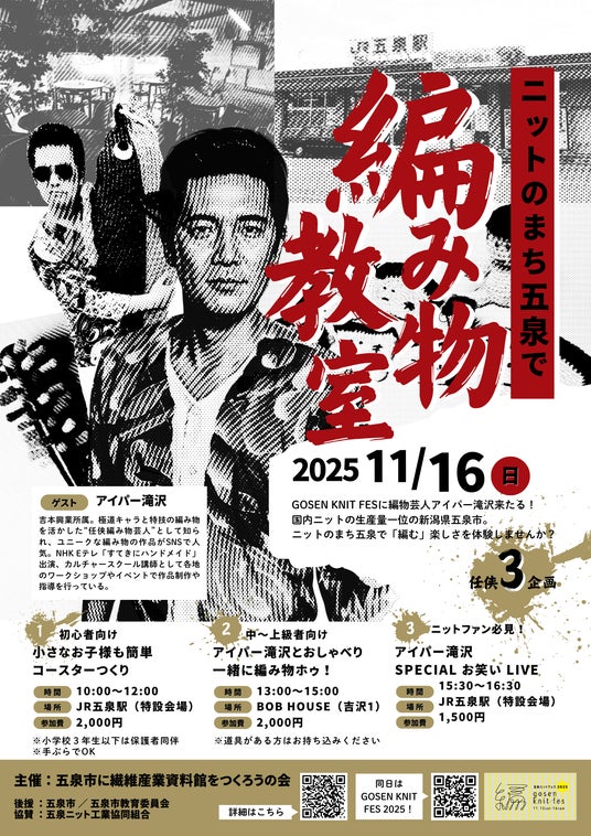 編物芸人アイパー滝沢、五泉に来たる!『五泉市に繊維産業資料館をつくろうの会』がおくるニットフェス特別企画!