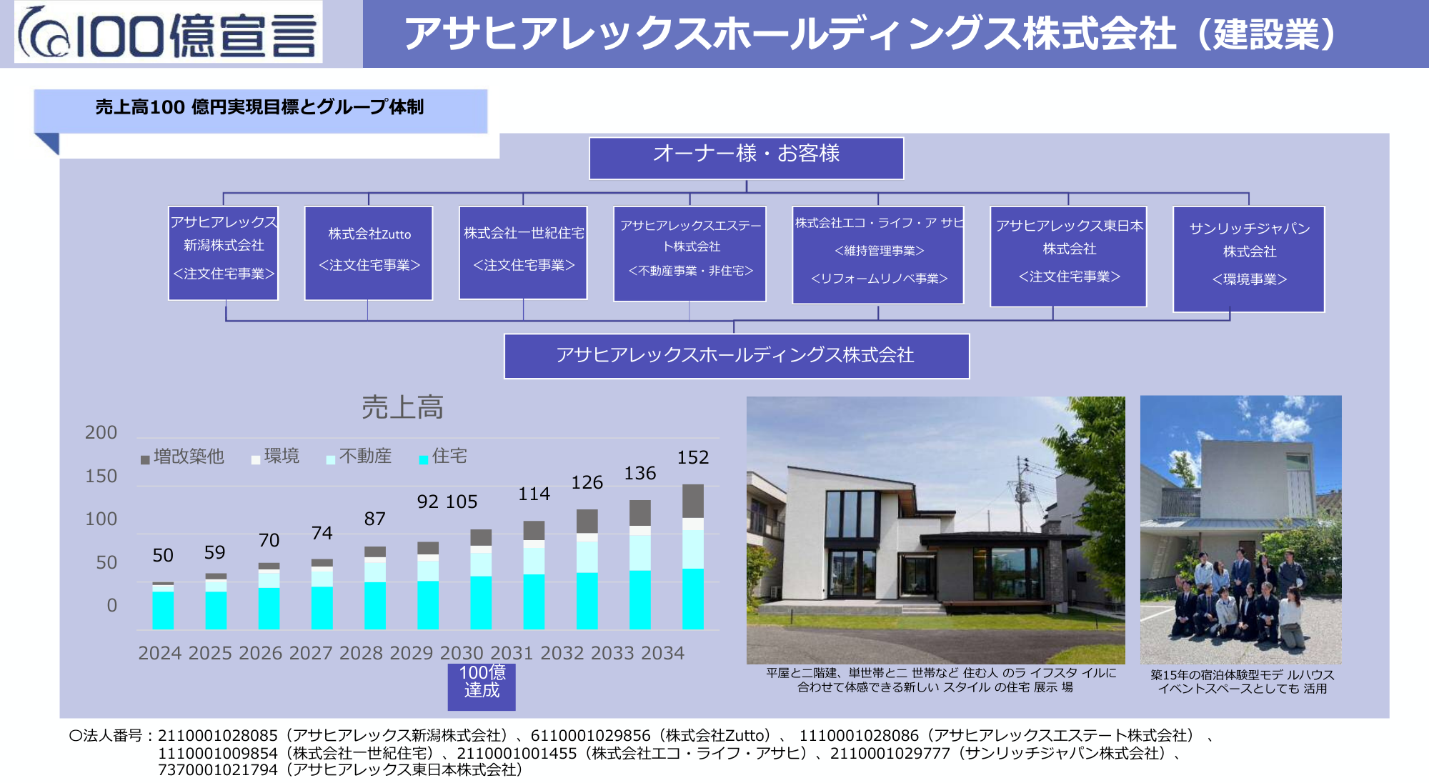 アサヒアレックスホールディングス株式会社(本社:新潟県新潟市中央区美咲町一丁目9番48号、代表取締役:石倉茂雄)は、新潟県内の住宅建設業として初めて「100億円宣言」を発表いたしました。グループ全8社が一体となり、現在の売上高50億円(グループ全体・2025年3月期)から2030年度に100億円達成を目指し、年率平均12%の成長を実現します。併せてDX認定取得も推進し、地域住宅産業の発展を牽引してまいります。