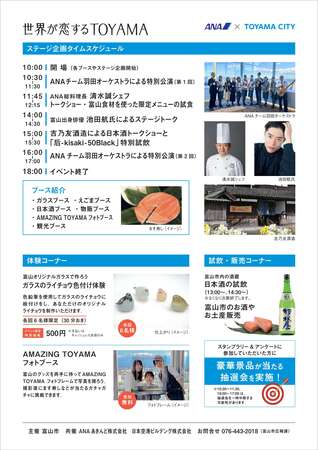 ANA総料理長考案の富山の食材を使用した限定メニューの試食提供や、ANAチーム羽田オーケストラによる演奏、日本酒の試飲に体験コーナーなど内容盛りだくさんです。ぜひご来場ください。