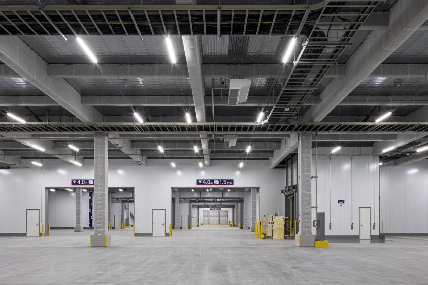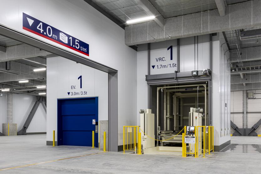1階に最大24台(10t車)が同時接車できるバースを備え、梁下有効高は約5.5mを確保(3階の一部区画を除く)しました。また、荷物用エレベーターおよび垂直搬送機を2基ずつ設置しています。