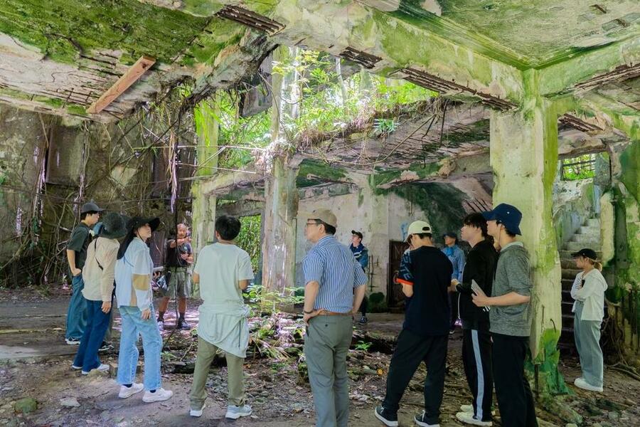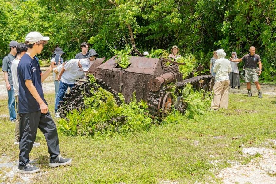 かつての激戦地ペリリュー島では、現地日本人ガイドから説明を受けながら、千人洞窟や海軍司令部跡、平和記念公園やオレンジビーチ、滑走路付近などを訪れました。爆撃を受けた建物や壁に残る弾痕、破壊され錆び付いた戦車、激しく損傷した兵士の所持品などを各所で目の当たりにし、学生らは戦争の悲惨さを強く感じました。また、戦没者慰霊碑の前では全員で黙祷を行い、線香を手向け、平和への思いを共有しました。多くの戦跡を巡りながら当時の状況を理解し、平和について考える、意義深い機会となりました。