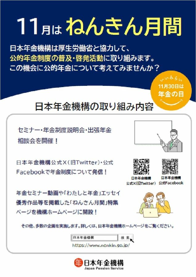 また、11月を「ねんきん月間」と位置づけ、国民の皆さまに年金制度に対する理解を深めていただくため、公的年金制度の普及・啓発活動を行います。