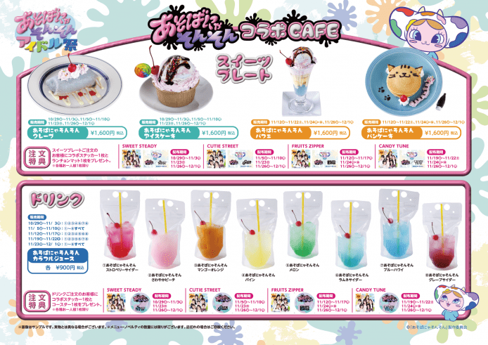コラボカフェでは、8種類のフレーバーから選べるカラフルな「あそばにゃそんそんカラフルジュース」(900円/税込) と、4種類の「あそばにゃそんそんスイーツプレート」(1,600円/税込)を提供します。