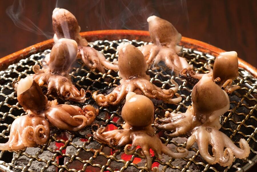 七輪の上で踊るように焼き上がる、イイダコのライブ感。