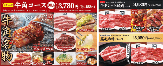 『牛角コース』『牛タン・上焼肉コース』『黒毛和牛コース』なら食べ放題!