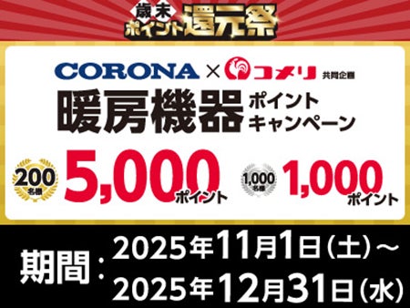 CORONA暖房機器ポイントキャンペーン期間中、CORONA暖房機器をお買い上げの方に抽選でポイントプレゼント。