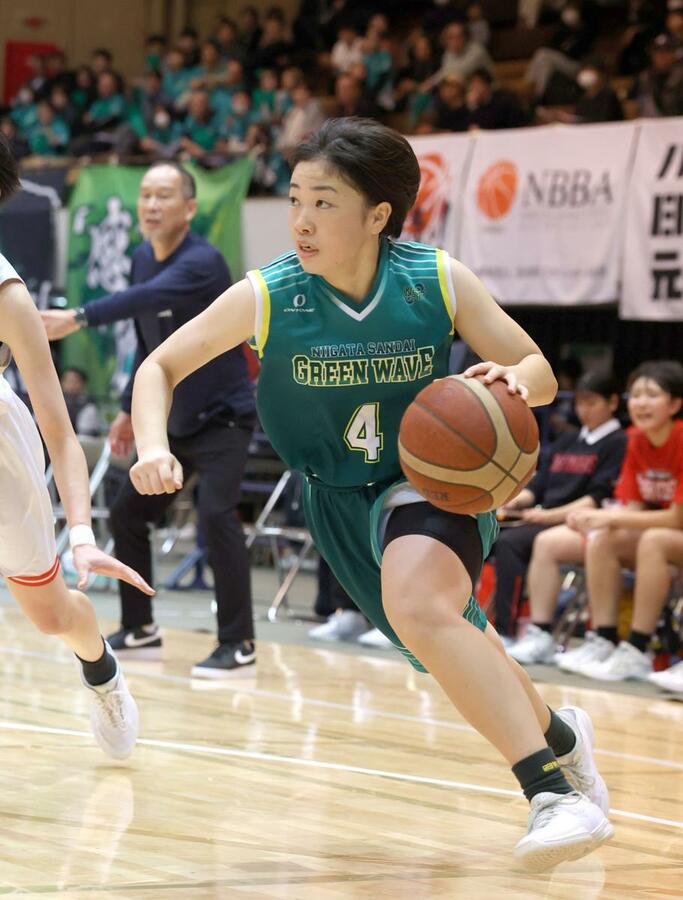 女子決勝 開志国際-新潟産大付 第4クオーター、ドリブルで切り込む新潟産大付の草壁紗寧=新潟市体育館