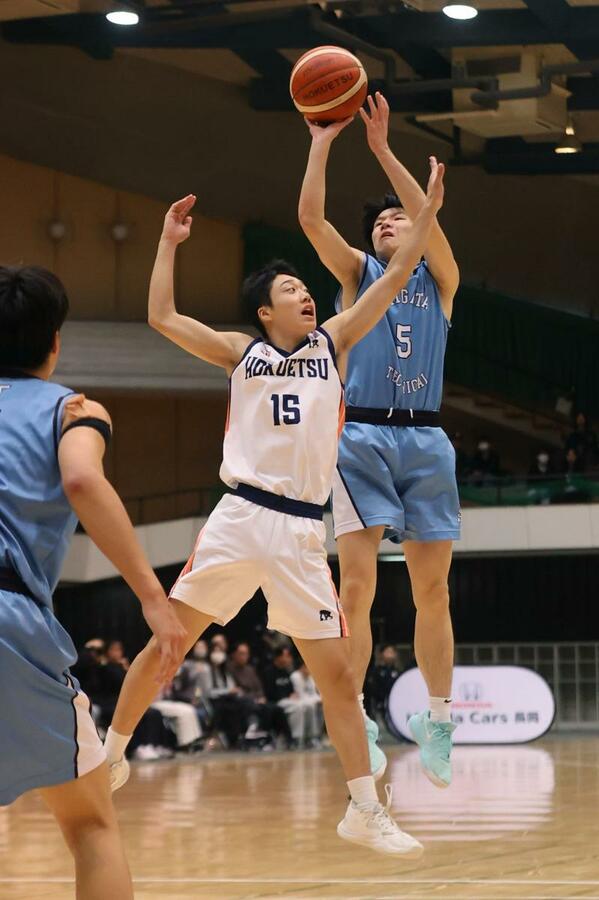 男子決勝リーグ 北越-新潟工 第4クオーター、北越の新田見天翔がシュートを決め78-75=新潟市体育館