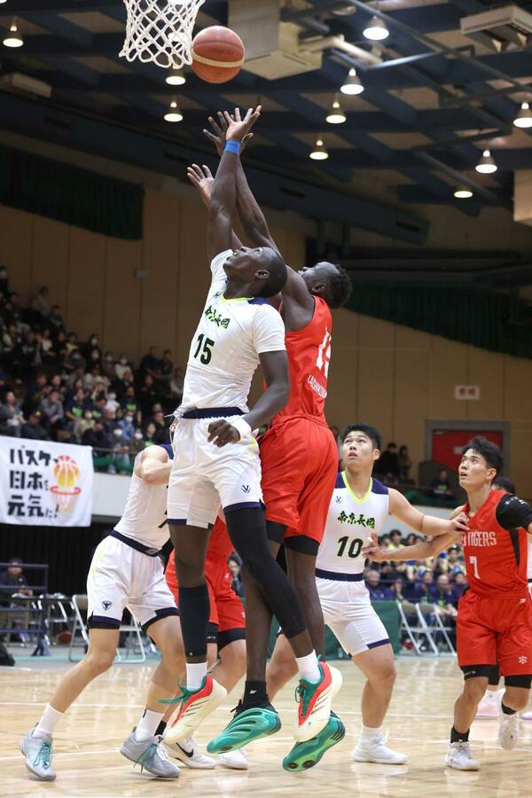 男子決勝リーグ 帝京長岡-開志国際 第2クオーター、リバウンドを競り合う帝京長岡のジョベ・パ・マリック=新潟市体育館