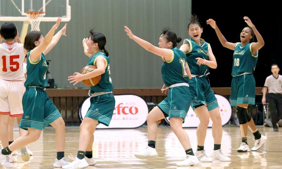 女子決勝 開志国際-新潟産大付 2連覇を決め、喜びを爆発させる新潟産大付のメンバー=新潟市体育館(写真映像部・立川悠平)