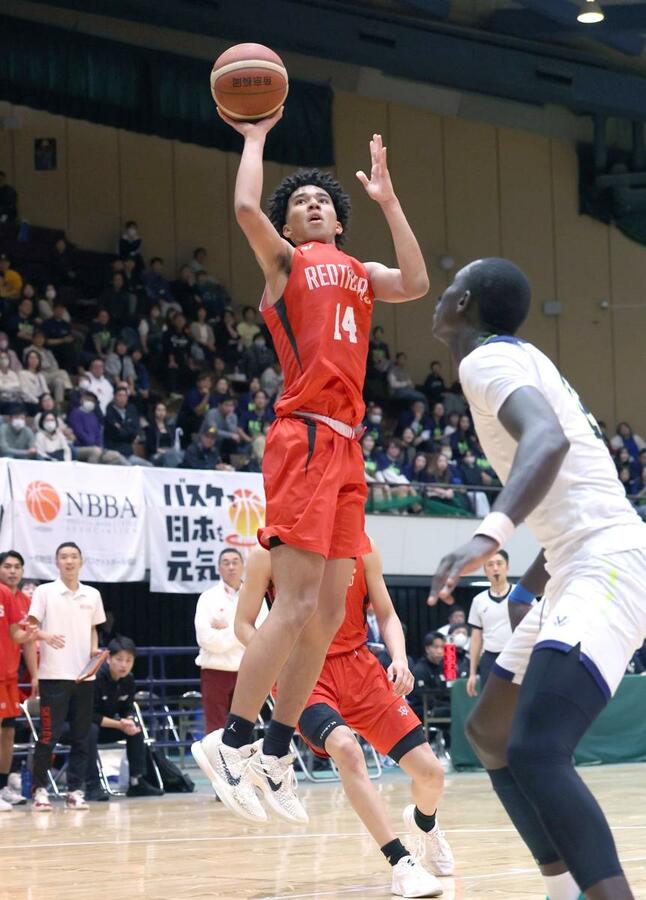 男子決勝リーグ 帝京長岡-開志国際 第1クオーター、シュートの際にファウルをもらう帝京長岡の赤澤翔心=新潟市体育館