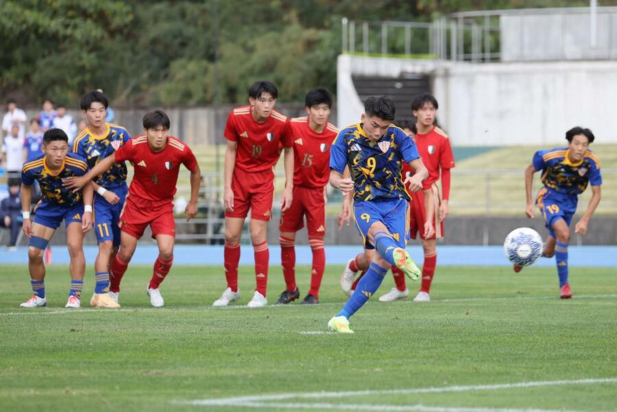 準決勝 開志学園JSC-新潟明訓 前半28分、開志学園JSCのFW北野鈴雄がPKを決めて2-2=新発田市五十公野公園陸上競技場