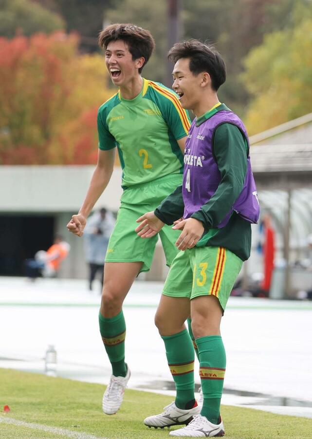 準決勝 帝京長岡-北越 後半10分、先制ゴールの帝京長岡のDFリヴキン辻アーロン(左)が喜ぶ=新発田市五十公野公園陸上競技場
