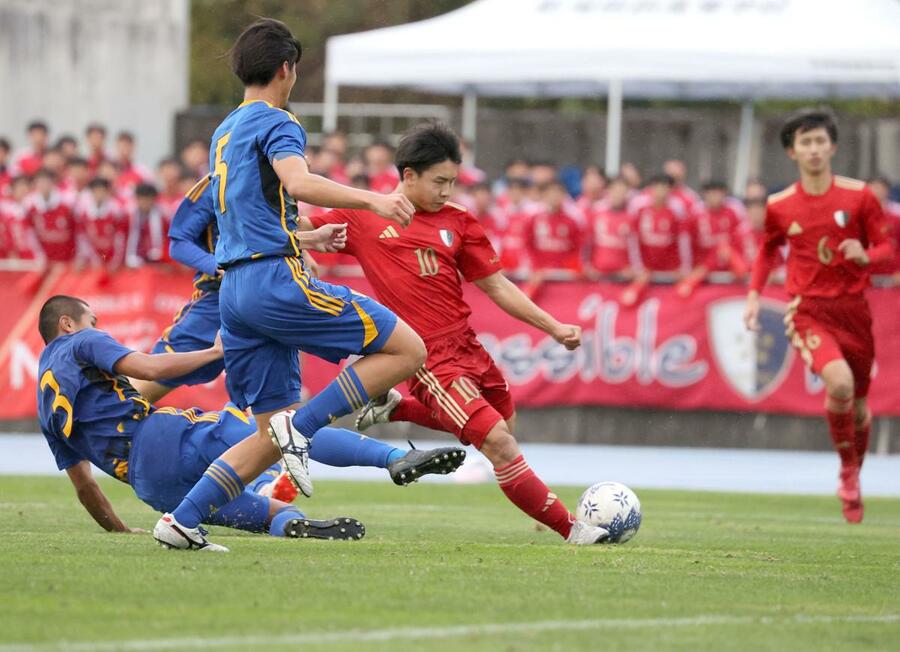 準決勝 開志学園JSC-新潟明訓 後半32分、新潟明訓のFW田代蓮翔が決めて4-2=新発田市五十公野公園陸上競技場