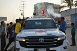1日、米ロサンゼルス・リトルトーキョーにある大谷翔平選手の壁画の前で、ドジャースのワールドシリーズ連覇を喜ぶファン(共同)