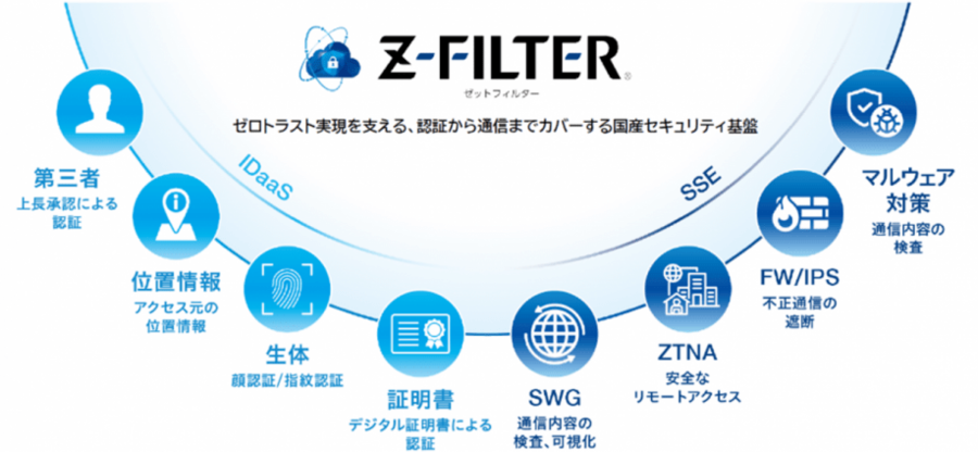 「Z-FILTER」は、Webやクラウド通信を許可リスト方式で制御し、URL・ドメイン・アプリケーション単位のポリシー適用、SaaSなどのクラウドサービス利用時に機能単位でアクセスや操作を制御する機能、通信の可視化とログ分析を備えた国産SSE(Security Service Edge)+IDaaS(Identity as a Service)ソリューションです。パスワードレス認証(Passkey)や証明書、多要素認証、端末のひも付けといった認証機能(IDaaS)を同一基盤に内包することで、ユーザー認証からアクセス制御まで、複数製品をまたがずに実現し、高い安全性と運用の簡易化を可能にします。