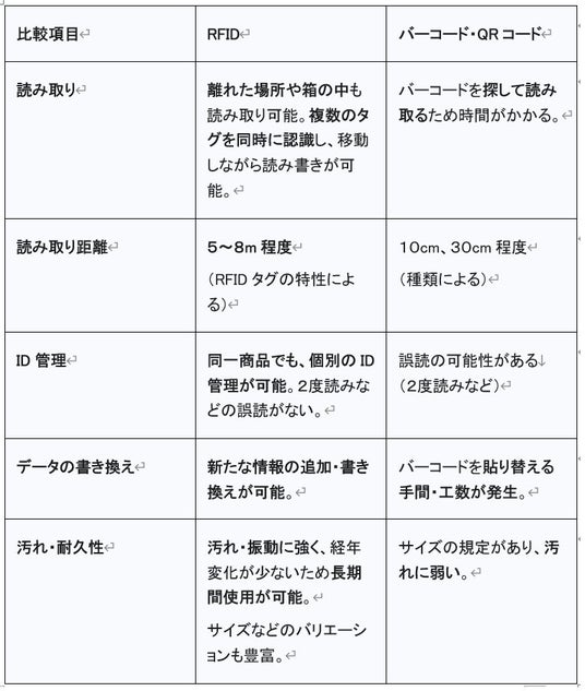 1.RFIDは、従来のバーコードやQRコードと比較して、特に以下の点で優れたメリットを提供し、