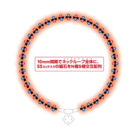 ・コラントッテ独自のN極S極交互配列でネックループ全体に55ミリテスラの磁石を10mm間隔に配置しています。この配列により磁力が広範囲に影響し、装着部位の血行改善、コリを緩和します。