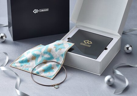 トップデザインとカラーをイメージしたオリジナルタオルハンカチをノベルティとしてお付けし、ネックレス本体とともに限定ボックスにいれてお届けします。専用のお渡し用ショッパー付きですので、ギフトとしても最適です。冬の装いに寄り添う上品な輝きと、心温まるパッケージをお楽しみください。