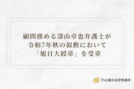 TMI総合法律事務所(所在地:東京都港区、代表:田中克郎)の顧問務める深山卓也弁護士が、令和7年秋の叙勲において「旭日大綬章」を授与されることとなりましたのでお知らせいたします。「旭日大綬章」は国や公共に対し功労のある人物で、顕著な功績をあげた者に授与される勲章です。深山弁護士は、最高裁判所判事等として我が国の司法制度の発展に大きく貢献したことが評価されました。